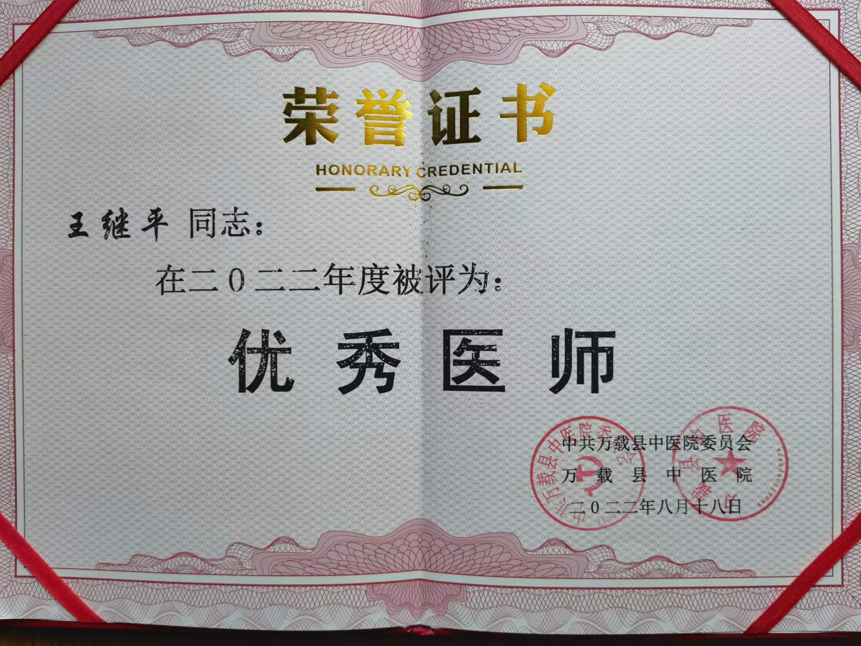 王继平老中医在2022年8月19日第五个“中国医师节”上荣获“优秀医师”称号